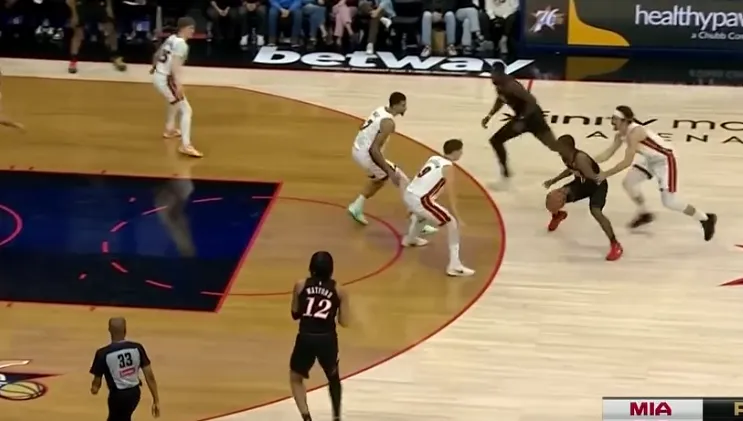 马克西手递手接球后立即衔接“Stack”战术发起,右路突破至三分线后,